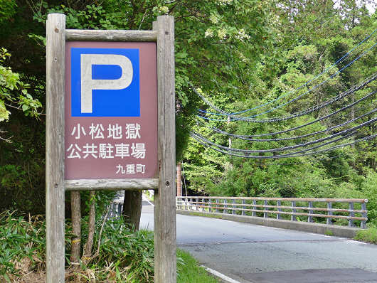 しばらく泉水グリーンロードを走ったら、県道40号と合流して筋湯温泉の旅館街を抜けると「小松地獄公共駐車場」と書かれた標識が見えてくるのでここに車を停めました。県道40号をこのまま先へ進むと、くじゅう森林公園スキー場の前を通って、再びやまなみハイウェイと合流して瀬の本高原へ出ます。