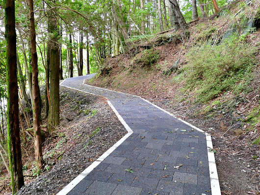 小松地獄へは途中から林の中の遊歩道を進みますが、以前は未舗装でぬかるみなどもあった遊歩道が、今回訪れてみるとコンクリートタイルが敷き詰められた立派な道になっていました。これだと雨上がりでも靴が汚れなくていいですね。