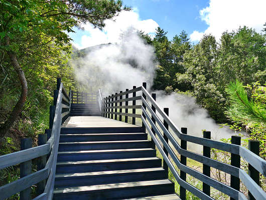 駐車場に車を停めたらさっそく噴き上がる噴気や熱泥、湧き上る熱湯など大地の息遣いを感じられる「小松地獄」へと向かいます。ここは令和2年7月豪雨で被害を受けて立入禁止になって、今年の7月にようやく修復工事が終わって5年ぶりに見物を再開したんですよね。