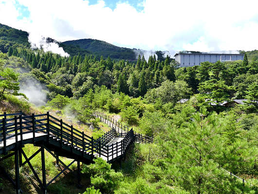 新しい木道は以前の木道よりも山の斜面の上部に造られていて、ここからは小松地獄を見下ろすような感じなります。小松地獄は画像の左側手前の噴気が上がっている辺りです。そして画像の右上には大きな建物も見えていますが、ここは日本最大の地熱発電所の八丁原(はっちょうばる)地熱発電所です。