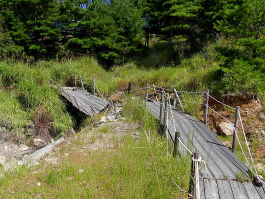 遊歩道を200mほど進むと、道はコンクリートタイルから木道に変わりました。そして木道の斜め下からはモクモクと噴気が上がっていました。この木道は被災後に新たに造られたものです。