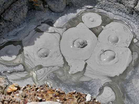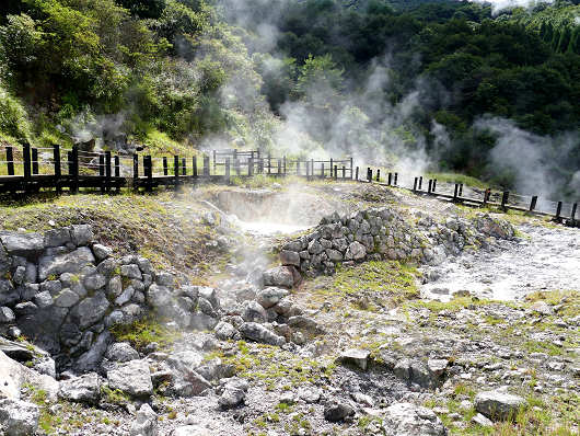 木道をさらに先へ進むと、噴き上がる噴気や熱泥、湧き上る熱湯などを目の前で見れる小松地獄に到着です。