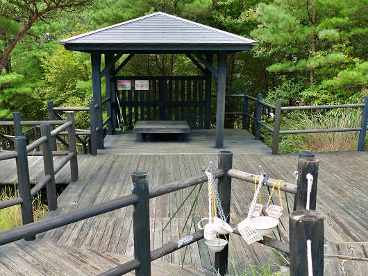 卵を入れるざるは東屋の前の手摺部分にたくさん置かれていて、熱湯で火傷をせずに温泉卵が作れるように、それぞれのざるには長い棒もセットになっていました。