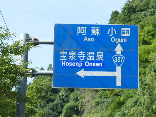 道の駅「童話の里くす」を出発して国道210号へ出たら、来た道を少し戻って小国町方面へと続く国道387号へ進んで、しばらく走っているとこの様な標識が見えてきました。