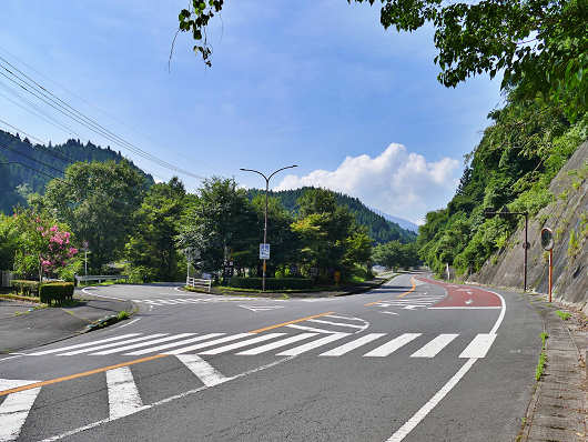 標識の先は道が二手に分かれていて、右の直進する道は国道387号で小国方面へと続き、左折する道は宝泉寺温泉の温泉街へと続いています。
