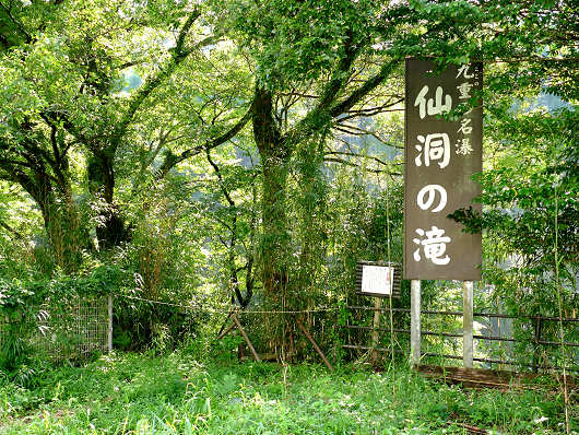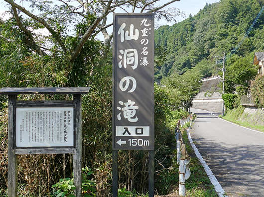 車道を300mほど歩くと「仙洞の滝」の看板が見えてきました。右側の車道は数百mも先へ進むと宝泉寺温泉の温泉街に到着します。