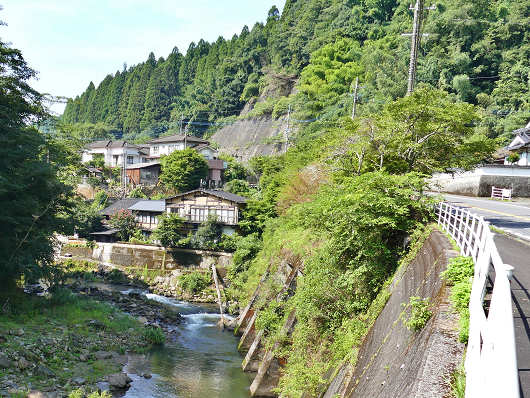 国道の歩道から道路の下を流れる町田川の上流を眺めると、川沿いの崖のようなところに数棟の建物が見えました。ここが「壁湯温泉」です。