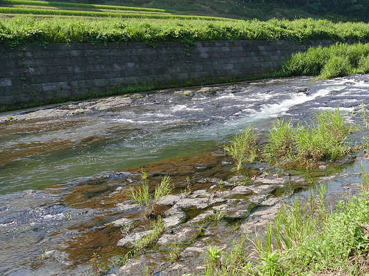 舗装された遊歩道(車道?)の横は清流の町田川が流れていて、川底の岩盤の上を浅い流れのきれいな水が滑るように流れて、小さな子供でも水遊びが楽しめそうな感じでした。