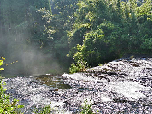 でもそのすぐ下流では川底の岩盤が途切れていて、激しい水音をたたて水が流れ落ちて水煙も上がっていました。ここが仙洞の滝の水の落ち口のようでした。滝自体は全く見えませんでしたが、激しい水音から想像するとかなり豪快な滝のようでした。
