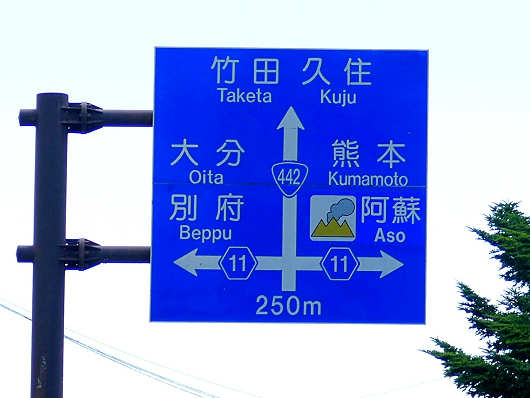 瀬の本レストハウスへは竹田市方面から国道442号を走ってきましたが、国道442号はやまなみハイウェイ(県道11号)との交差点を過ぎると、人気温泉地の黒川温泉などを経由して福岡県八女市方面へと続き、交差する県道11号は大分方面へ進むと、湯布院盆地を経由して別府市へ、そして熊本方面へ進むと、阿蘇盆地へと続いているので、この交差点は中九州観光の要のようなところなんですよね。