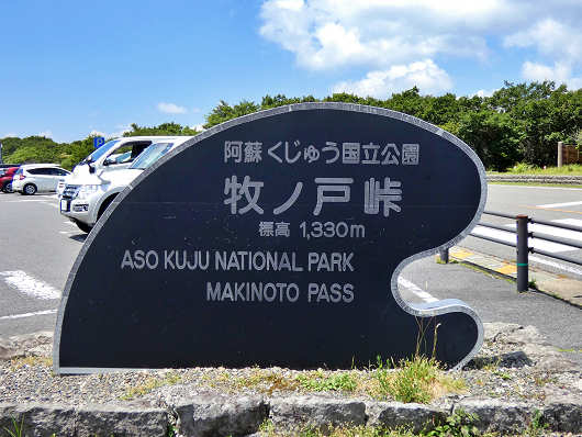 しばらく急カーブの続く上り坂を走って行くと、やまなみハイウェイ最高地点で標高1330mの牧ノ戸峠に到着しました。