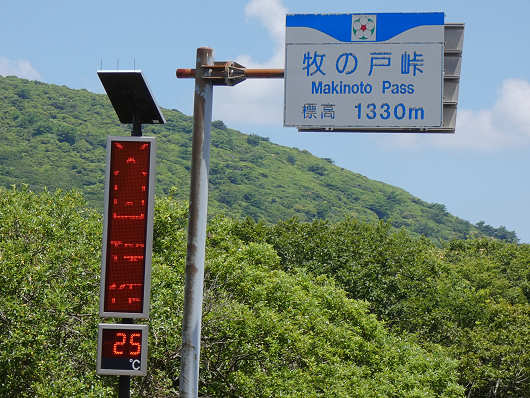 この日も平地では気温が35℃を超える猛暑日でしたが、道路沿いに立てられた電光表示板を見たら、平地よりも10℃も気温が低い25℃を表示していました。気温は標高が100m上がるごとに0.6~0.65℃下がるといわれているので、単純計算しても標高1330mの牧ノ戸峠は平地よりも8.6℃も気温が低いことになりますね。
