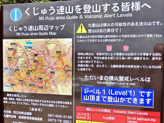 登山口にはこのような注意書きも立てられていました。くじゅう連山は現在でも活発に噴火を繰り返している阿蘇山や霧島連山などと違って、噴火のイメージがありませんが、今でも噴気を上げている硫黄山などもあって、噴火の可能性が高い活火山なんですよね。