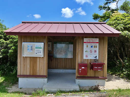 今回ここを訪れてみると、以前は無かった小さな小屋が登山口付近に建てられていました。中へ入ってみるとベンチなどは無くて、登山届を入れるポストのようなものだけがありました。