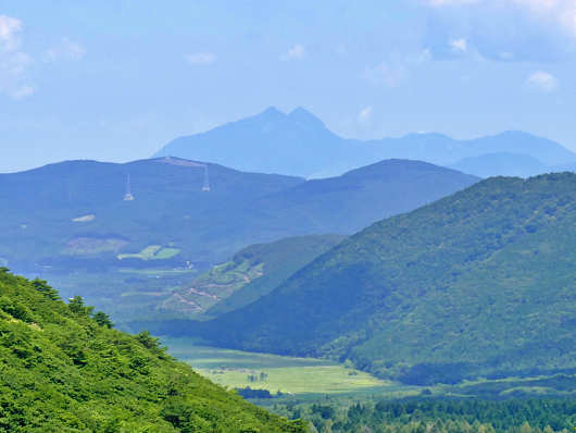 登山口付近から湯布院方面を眺めると、遠くに由布岳が霞んで見えました。そして手前のほうには周囲を山に囲まれるように草原が広がっていましたが、ここは次に訪れる標高1000mの飯田高原(はんだこうげん)に広がる「タデ原湿原」でしょうか?
