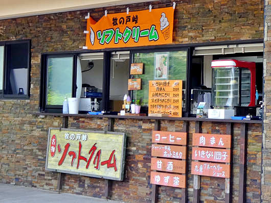 牧ノ戸レストハウスでは店頭でソフトクリームなどのテイクアウトの販売も行っていて、くじゅう連山への登山を終えて下山した登山者が、疲れた体を癒すようにベンチに座ってソフトクリームを食べている光景をよく見るんですよね。