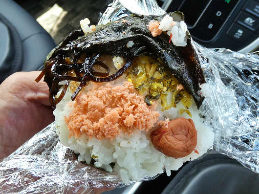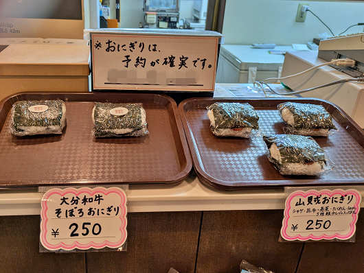 店内では登山者にも人気のおにぎりを売っていて、今回は運よくまだ残りがあったので、「大分和牛 そぼろおにぎり」と「山賊おにぎり」をひとつずつ買いました。