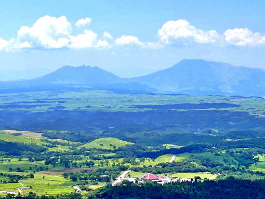 急坂の途中にある展望所から眺めた阿蘇方面の景色です。画像の下の方には先ほど訪れた瀬の本レストハウスが小さく見えていますが、牧ノ戸峠へはここからまだ標高を上げていくんですよね。