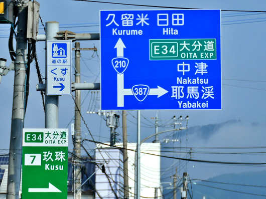 国道210号がやまなみハイウェイ(県道11号)との重複区間を過ぎて、長い下り坂になる頃には霧もすっかり晴れてきて、玖珠市街地へ入ったら耶馬渓方面へと続く国道387号へ右折しました。