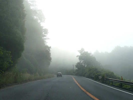 由布院盆地の入口辺りまで来ると、辺りは濃霧で由布岳も由布院盆地も全く見えませんでした。予定ではこの先で道の駅「ゆふいん」へ寄って、リニューアル工事の様子を見るつもりでしたが、この濃霧なので道の駅は帰りに寄ることにして先へと進みました。
