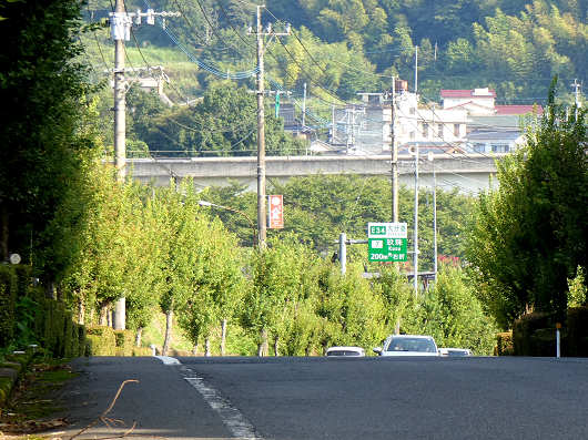 上り坂のピークから眺めた景色です。数百mほど先には大分自動車道の高架などが見えていますが、道の駅「童話の里くす」はこの高架の下辺りにあるので、道の駅に車を停めたらこの坂道を数百mほど登って来ることになるんですよね。