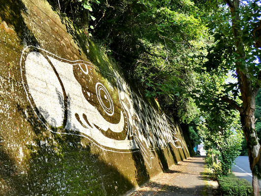 道の駅に車を停めたら、さっそく坂道を汗ビッショリになりながら登ると、歩道の壁面に巨大な鯉のぼりなどの苔アートが見えてきました。