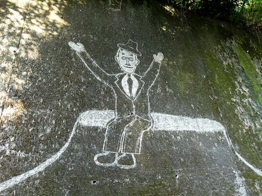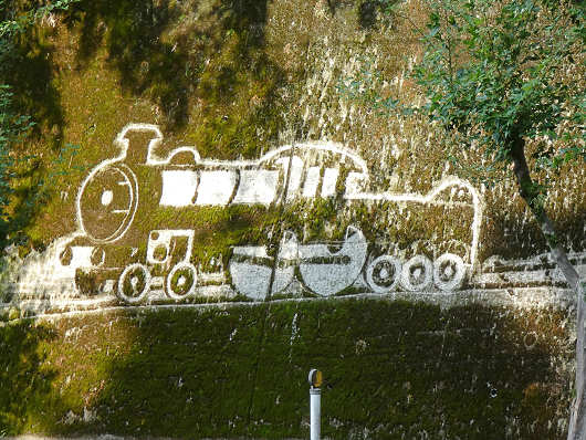 これらの苔アートは今年の5月に描かれたそうですが、ここを訪れる機会が無くて三ヶ月経ってからようやく見ることができました。作品はこの他にも切株山の山頂を飛び立つパラグライダーも描かれていましたが、崖から伸びてきた雑草に覆われてほとんど分かりませんでした。