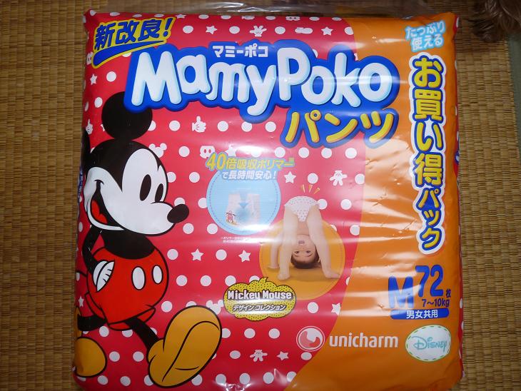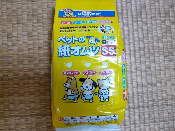 そこで次に買ったのが赤ちゃん用のオムツです、これがその時に買ったマミーポコパンツMサイズです。 赤ちゃん用なので当然尻尾を通す穴はありません、それにパンツタイプなので着脱はとっても簡単です。値段は72枚入りで1200円くらいです (一枚当り17円です)