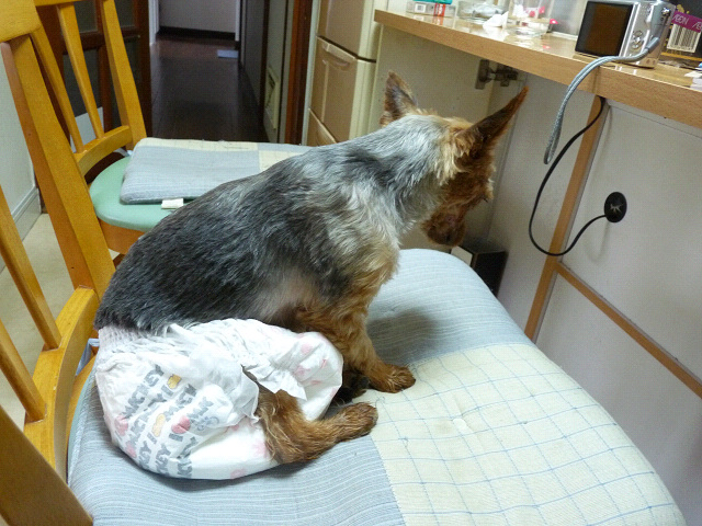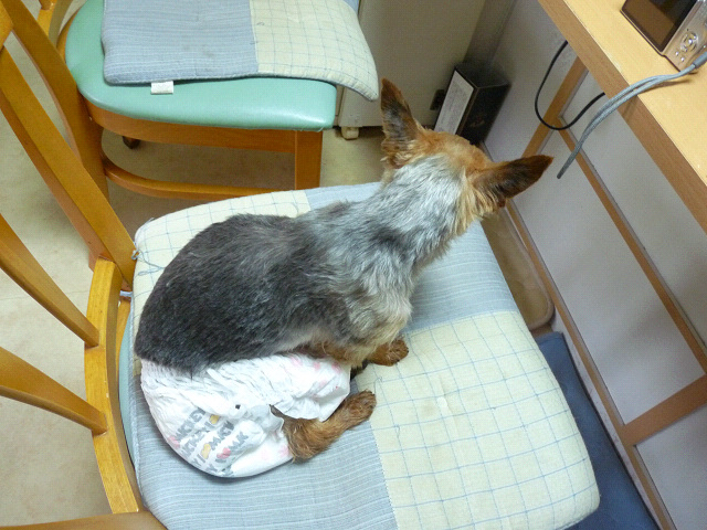 お尻をきれいに洗ってオムツを替えてあげると、その後はちょっと落ち着いたのかイスに飛び上がって静かに寝てしまいました。