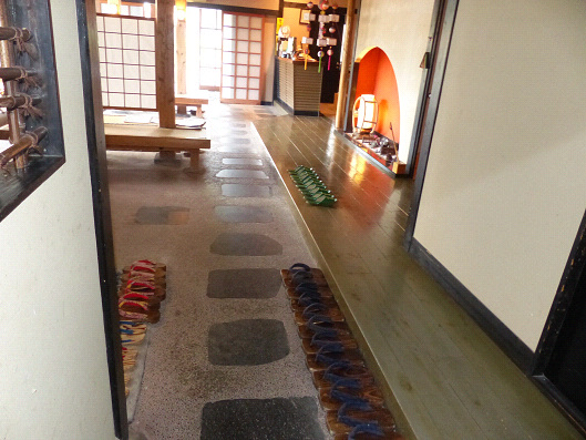 この画像は玄関を入ってちょっと奥から入口側を写したものだけど、ずらりとスリッパと下駄が並んでいました、なんだか昔の温泉旅館って感じで懐かしいよね、