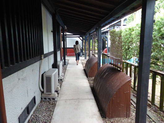 今夜泊まるお部屋は離れだから本館を通り抜けて中庭の廊下を歩いて行きます、正面に見えてる暖簾のかかった扉は男性用の大浴場(中浴場?)だよ、そして画像の左には玄関の土間の一部しか写ってないけど、ちょっと小さめの離れのお部屋があるよ、