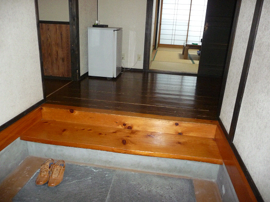 お部屋に上がってから玄関を見たらこんな感じだよ、奥には囲炉裏の部屋が見えています、