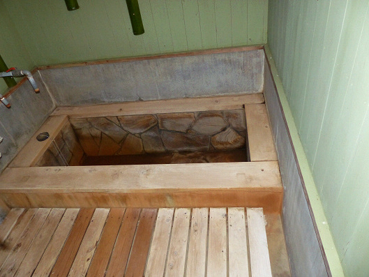 お風呂はヒノキ風呂です、大人が一人で入るにはゆったり過ぎるくらいの大きさです、お湯はもちろん温泉だよ、湯量の調整も自由に出来るから、かけ流しでゆっくり入るのもいいかもね、
