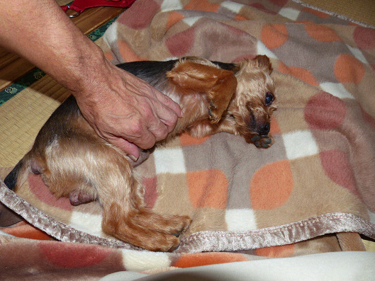 6畳の和室にりゅう君専用の毛布を敷いたら、さっそくりゅう君は毛布の上に寝転んで、もうこんなにリラックスしています、