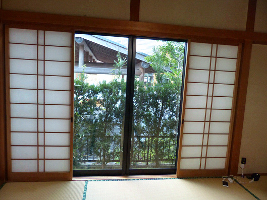 8畳の部屋の障子を開けたら、ひしかり交流館の”黄金の湯”の屋根が見えました、本当にお隣さんなんだね(笑)