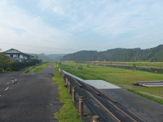 旅館のすぐ裏手は川内川(せんだいがわ)の土手になっています、こっちは下流側で向こうの方に見えてる可動堰の横にはガラッパ公園ってのがあって、たくさんの河童の像や湯之尾の滝があります、ここから歩いても行けるんだけど明日ゆっくりと見学するんだって、