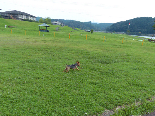 河川敷にはこんなに広い緑があります、河川敷だから車の心配は全く無いし、まるでドッグランみたいだね、ここはワンコにとっては最高のお散歩場所だよ、でも向こう側の柵の中はグラウンドゴルフのコースだから入っちゃダメだよ、