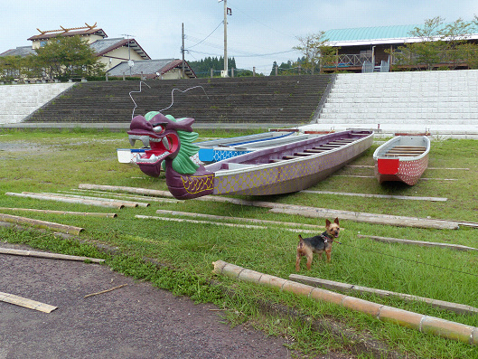 ここにはこんな不思議な船もありました、ドラゴンボートだよ、たくさんの漕ぎ手が乗り込んで競漕する船で、沖縄のハーリーが有名だよね、でもこんな山の中に何でドラゴンボートなんだろうね?
