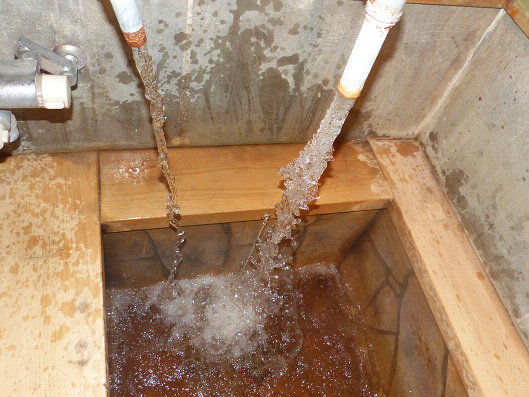 お散歩が終わってお部屋に戻ると、ママはお部屋の目の前の大浴場へ、パパはお部屋のお風呂に入ります、右の蛇口が温泉でこんな勢いで出るのですぐに浴槽いっぱいになります、でもちょっと熱めのお湯だから左の水も出しています、ここの温泉は菱刈鉱山の金の採掘の時に湧き出した温泉を直接引いてるそうだから、もしかしたら金が混じってるかも・・・(笑)