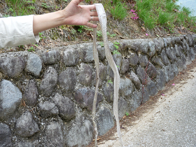 ママが蛇の抜け殻を見つけてきました、財布に入れたらお金が貯まるんだって、でも1.5mくらいあるのに財布に入るのかなぁ? それに気持ち悪いよ。