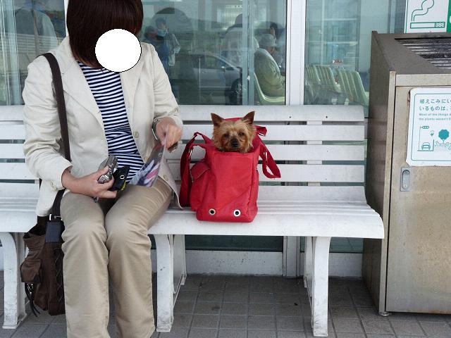 ママと一緒に外のベンチでフェリーが来るのを待っています。