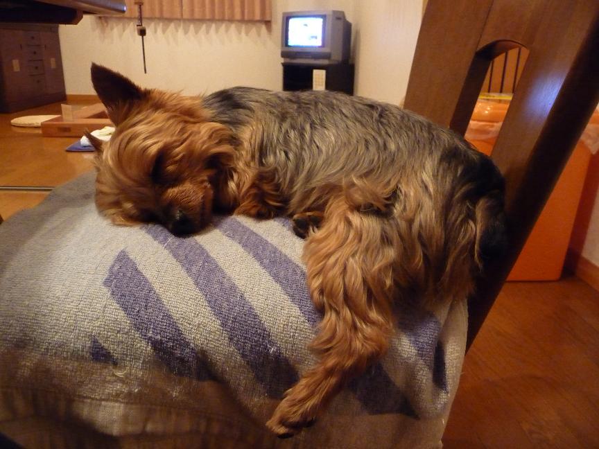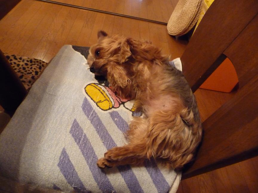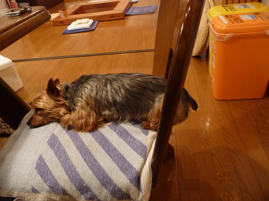 疲れて寝てます、僕の特技 お尻はみ出し寝です。(ただ胴体が長いだけですけど)