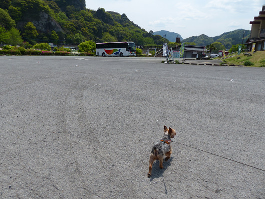 お土産屋さんのあった場所を通り過ぎて山国川を渡り反対側の駐車場に車を停めてりゅう君のお散歩です、今の時季の耶馬渓って新緑が目に眩しいほどきれいなんだけど、駐車場はGWの初日なのにこんなにガラガラでした、