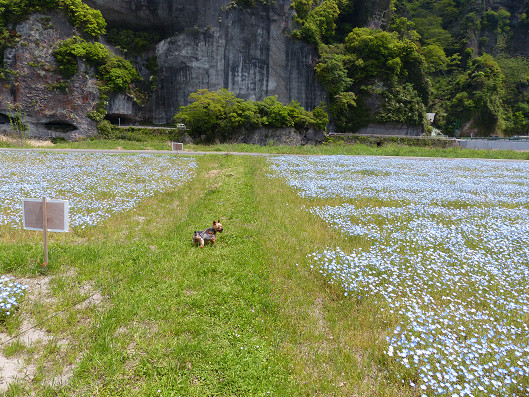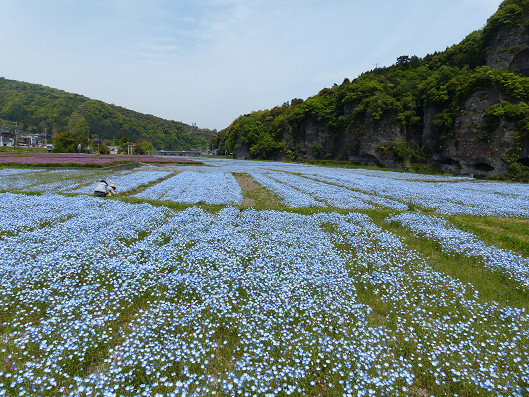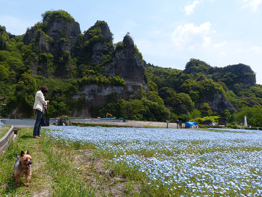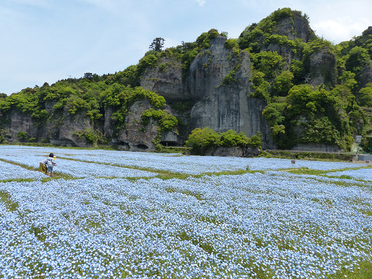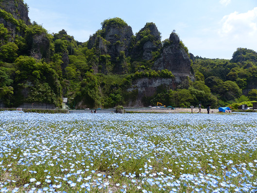 駐車場のすぐ横の田んぼにはたくさんのネモフィラが植えられています、そして向こうに見えてる岩峰は青の洞門です、