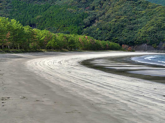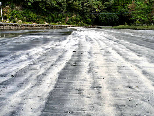 防波堤の先端部から眺めた波当津海岸です。波打ち際にはまだ足首ほどの深さの潮がありますが、潮が引くと見事な砂紋が現れるんですよね。