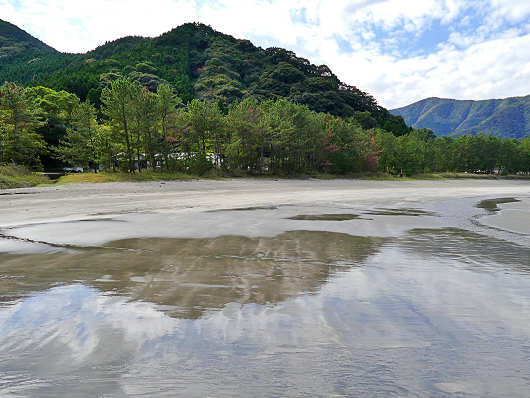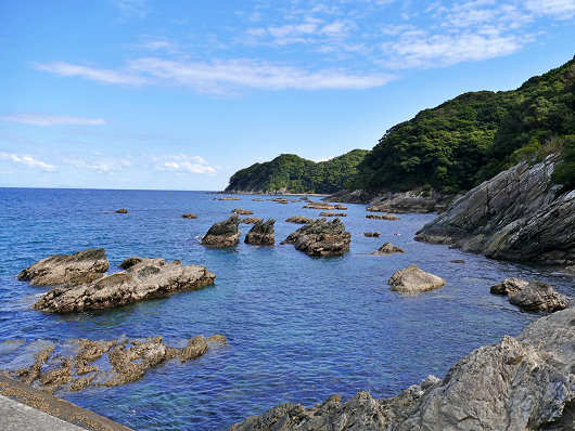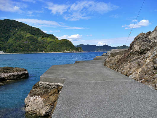 浜辺から眺めた沖合の風景です。この辺りは複雑に入り組んだ入り江がいくつもあるリアス式海岸なので、沖合には張り出した岬のような山がいくつも見えます。そして画像の右端には小さな防波堤が見えています。