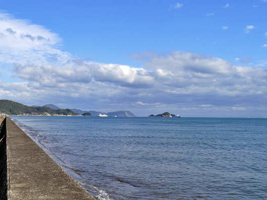 せっかく佐伯市まで来たので、佐伯湾に珍しい船でも停泊していないかと、佐伯湾が見渡せる番匠川の河口へ行ってみると、沖のほうに白い船体のフェリーらしき船が停泊していました。