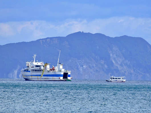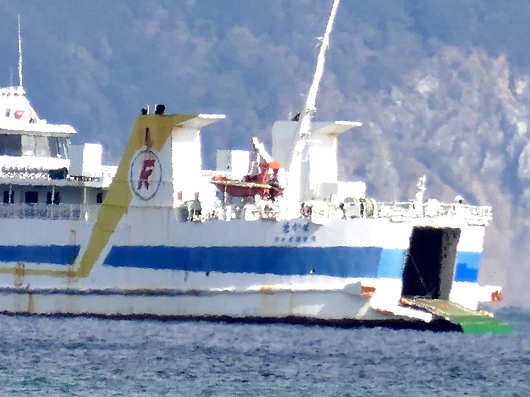 佐伯市には高知県宿毛市とを結ぶ「佐伯 宿毛フェリー」が運航していましたが、2018年に運航を休止して以来再開の目途は立っていないはずなのに、なぜフェリーが停泊しているんだろうかと望遠で撮影してみると、船尾のランプウェイが開いたままの通常ではありえない状態で、フェリーが錨泊していました。