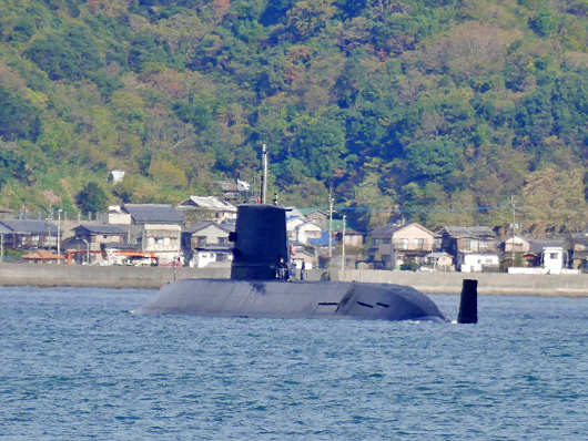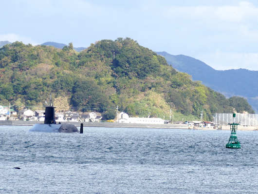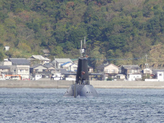 潜水艦には護衛艦などのように艦名が書かれていないので、この潜水艦の艦名は分かりませんが、艦尾の方向舵が垂直に1本だけ見えたので、最近建造された潜水艦じゃなくて、ちょっと古い型の潜水艦のようですね。
