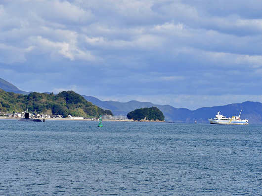 潜水艦の側面が見えるようになったので、フェリーと一緒に撮影してみました。ここへ来た時に最初からこの角度で潜水艦が見えていたらすぐに気付いていましたが、今回はブイと勘違いして危うく潜水艦を見逃してそのまま帰ってしまうところでした。